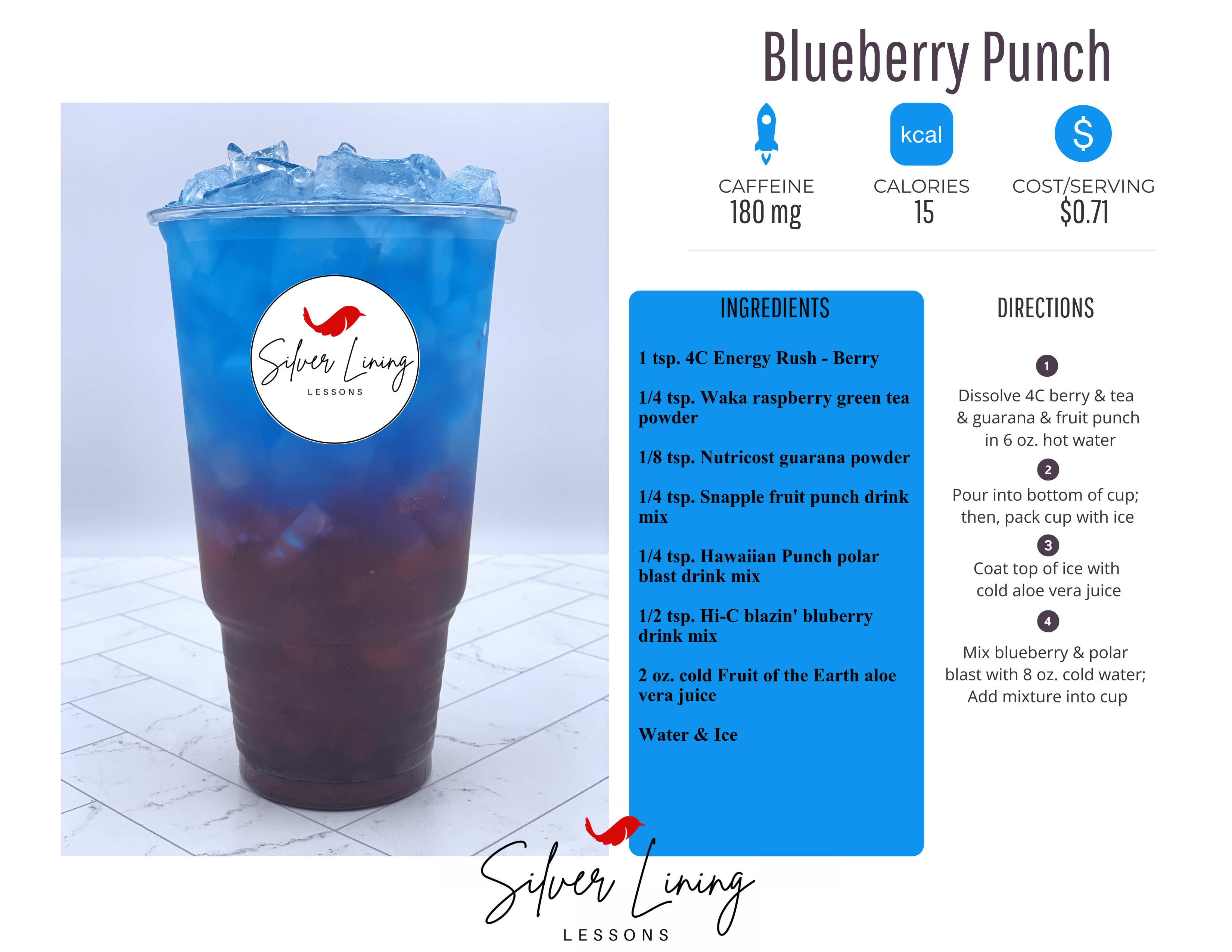 This tea has a unique blend of fruit punch, blueberry & polar blast.