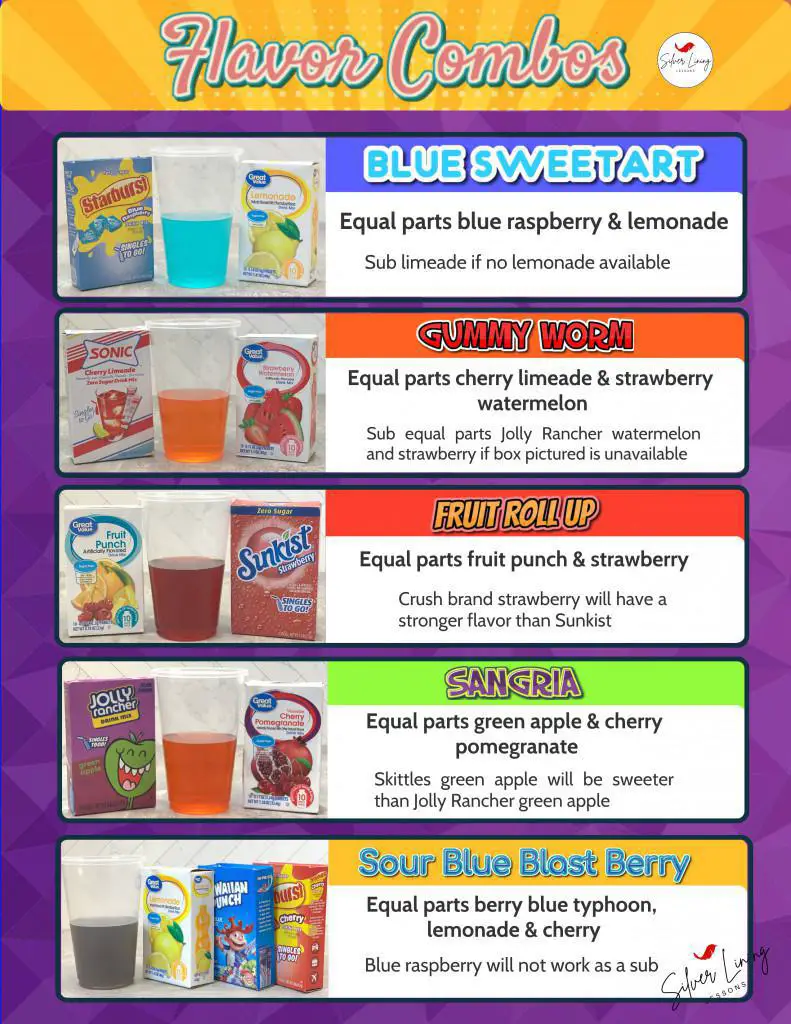 Let’s talk about FLAVORS! We all know there are tons of drink mixes that come in just about any flavor you can imagine. Most of them are self-explanatory, like the common strawberry, grape, orange and pineapple, just to name a few. However, you may see some of our recipes list flavors like Rainbow Candy and wonder what that means.