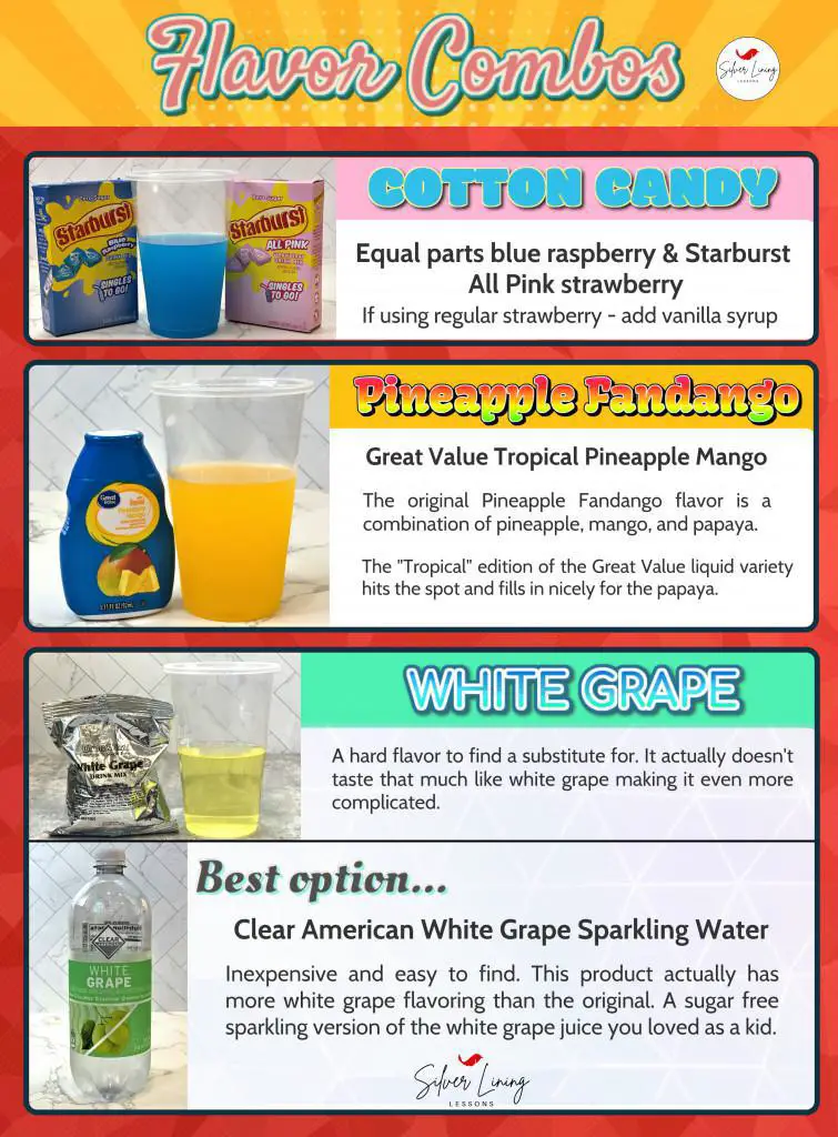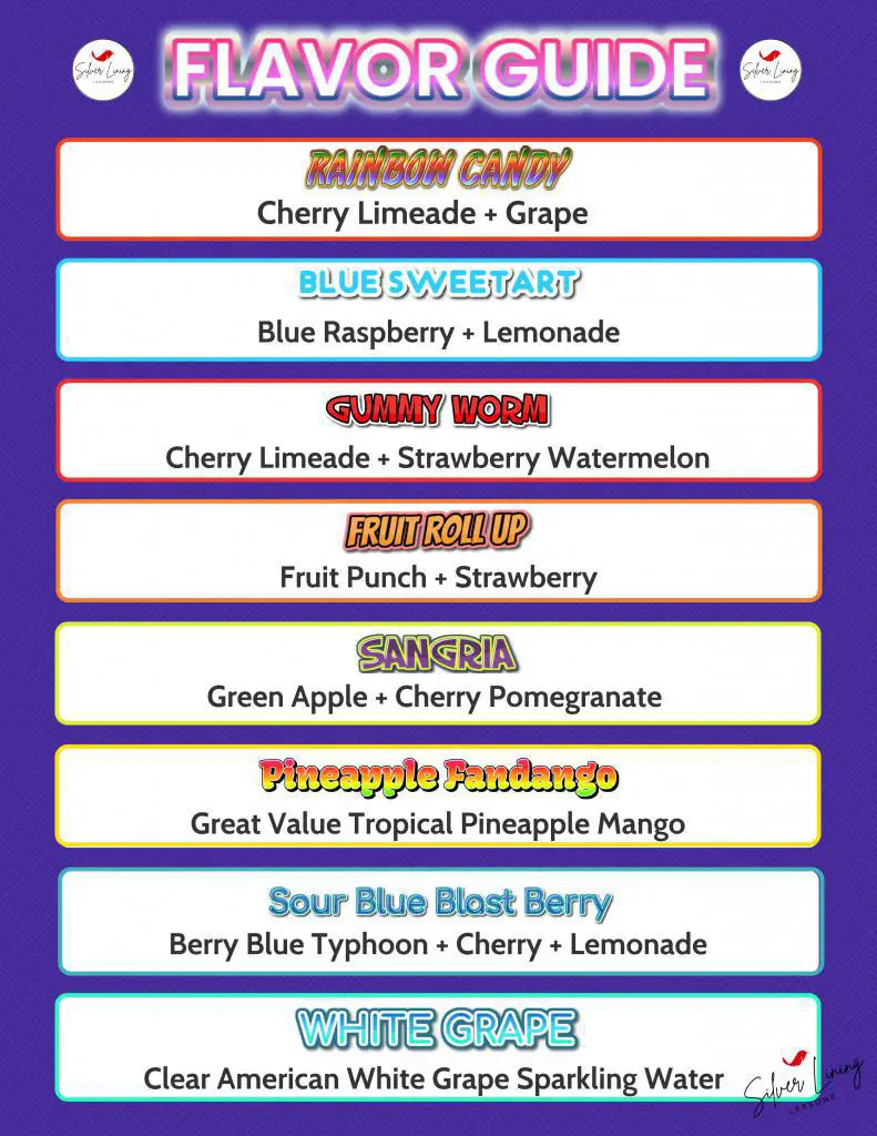 Replicating the Rainbow Candy flavor at home is simply mixing equal parts grape and cherry limeade. Our research shows that Sunkist grape and Sonic cherry limeade provide the most accurate results. The Sunkist and Sonic brand mixes can usually be found at most Walmart and grocery store locations but do vary depending on your region and availability. These can both be found on Amazon as well.