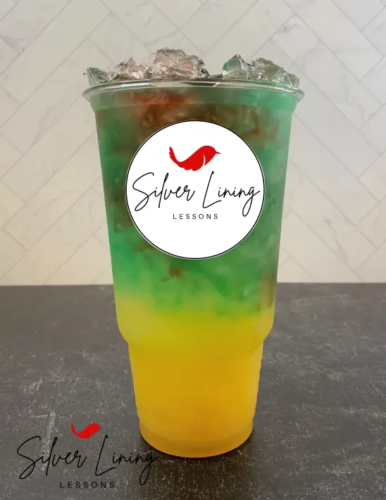 Mix rainbow candy (cherry limeade & grape) with 2 oz. cold water