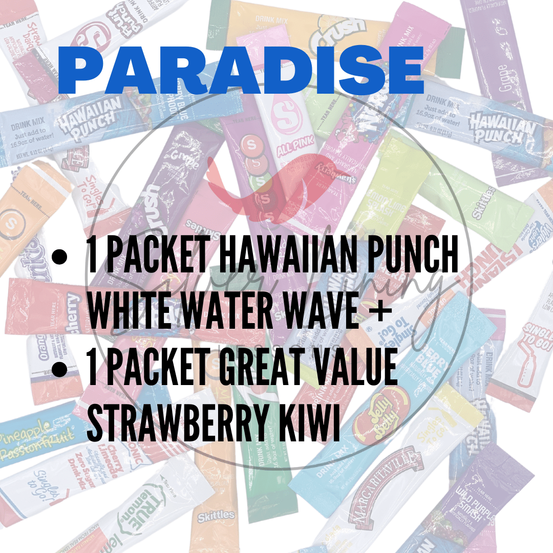 • Most drink mix packets contain about 1 teaspoon of powder. For purposes of these flavored water combinations, 1 full packet is 1 teaspoon; 1/2 packet is 1/2 teaspoon; and 1/4 packet is 1/4 teaspoon.