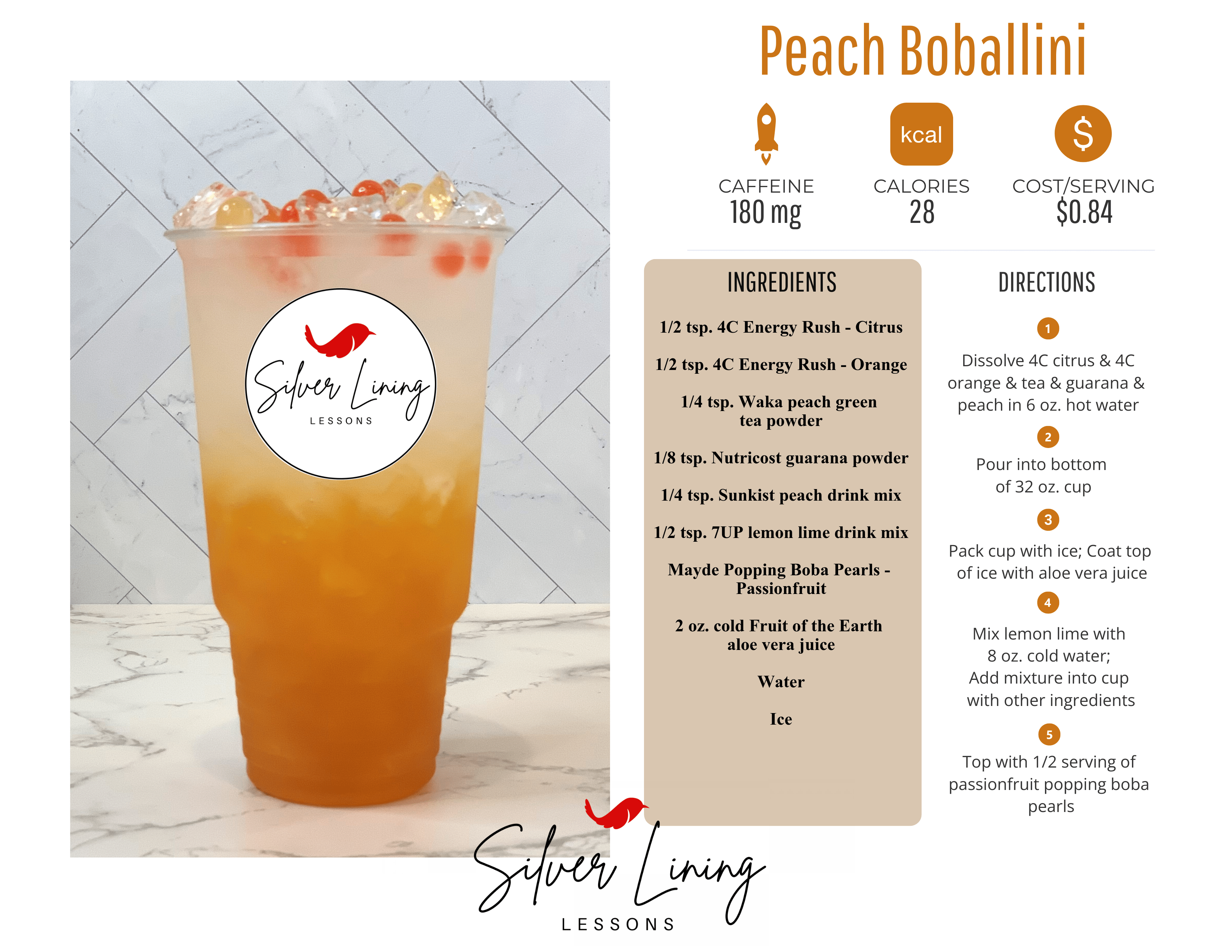 This creative take on a Peach Bellini uses peach, lemon lime & passionfruit boba.