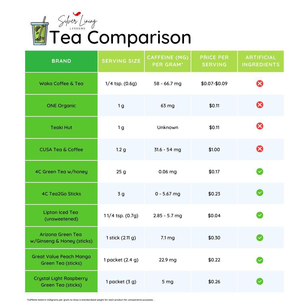 When sizing up different tea options, it is important to know why serving size matters. You will notice on the chart below that we broke down the caffeine content by milligram per gram for comparative purposes.