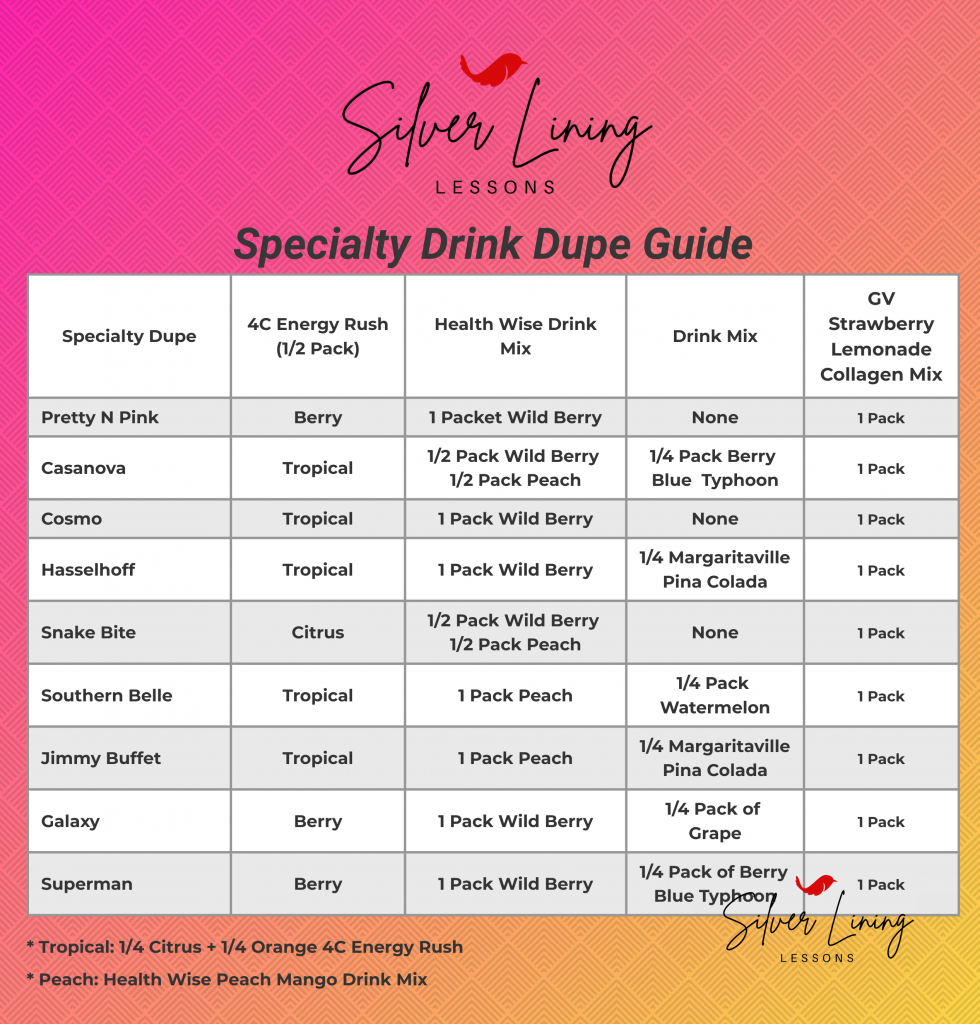 Even though we’ve made our way through dupes for the Liftoff, NRG, tea concentrate, aloe, collagen and flavor mixes, our inbox has still been blowing up with requests for the popular Specialty Drinks.