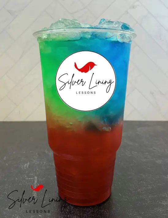 Add sour blue raspberry & sour green apple mixtures into cup on opposite sides