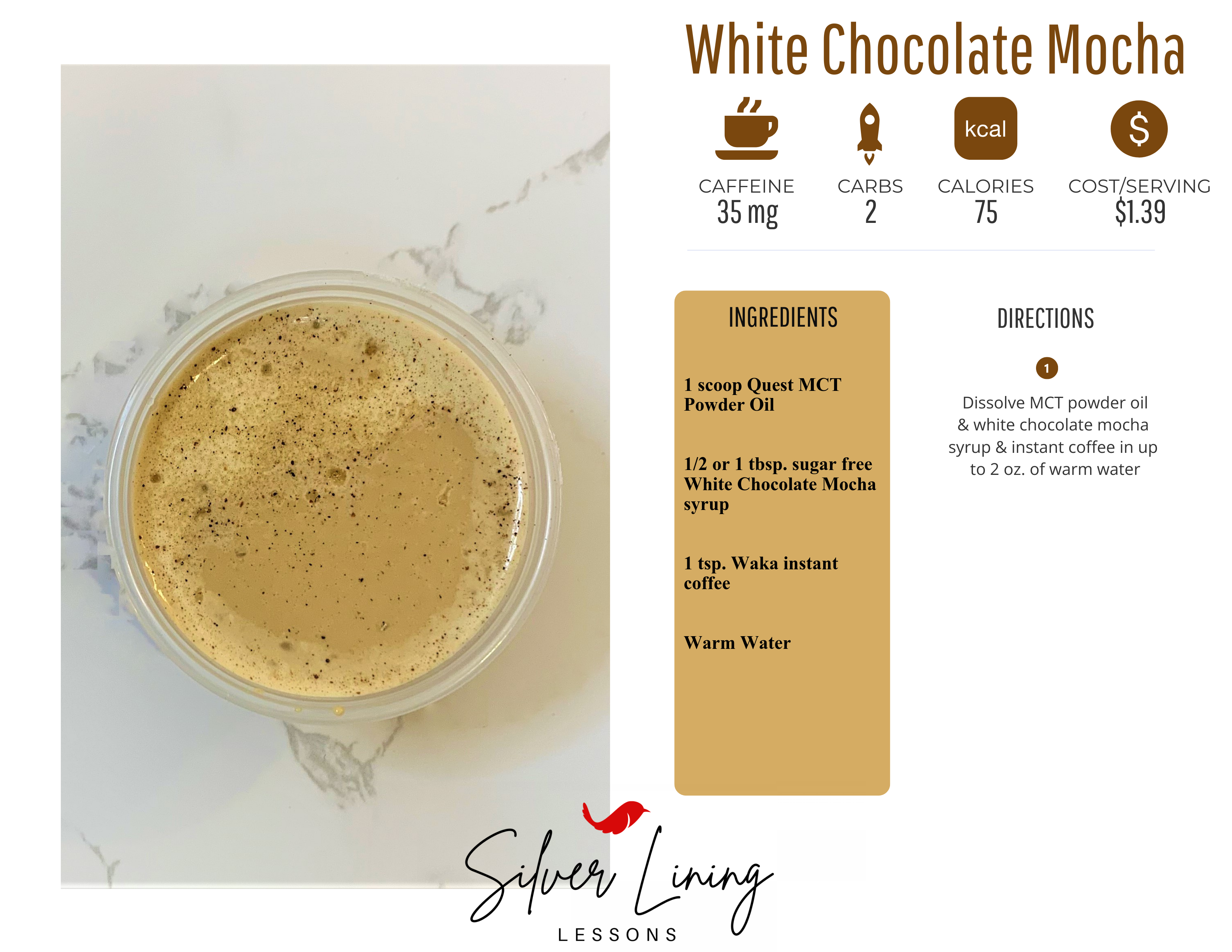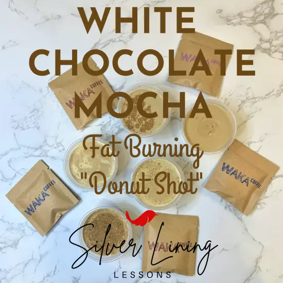 Dissolve MCT powder oil & white chocolate mocha syrup & instant coffee in up to 2 oz. of warm water
